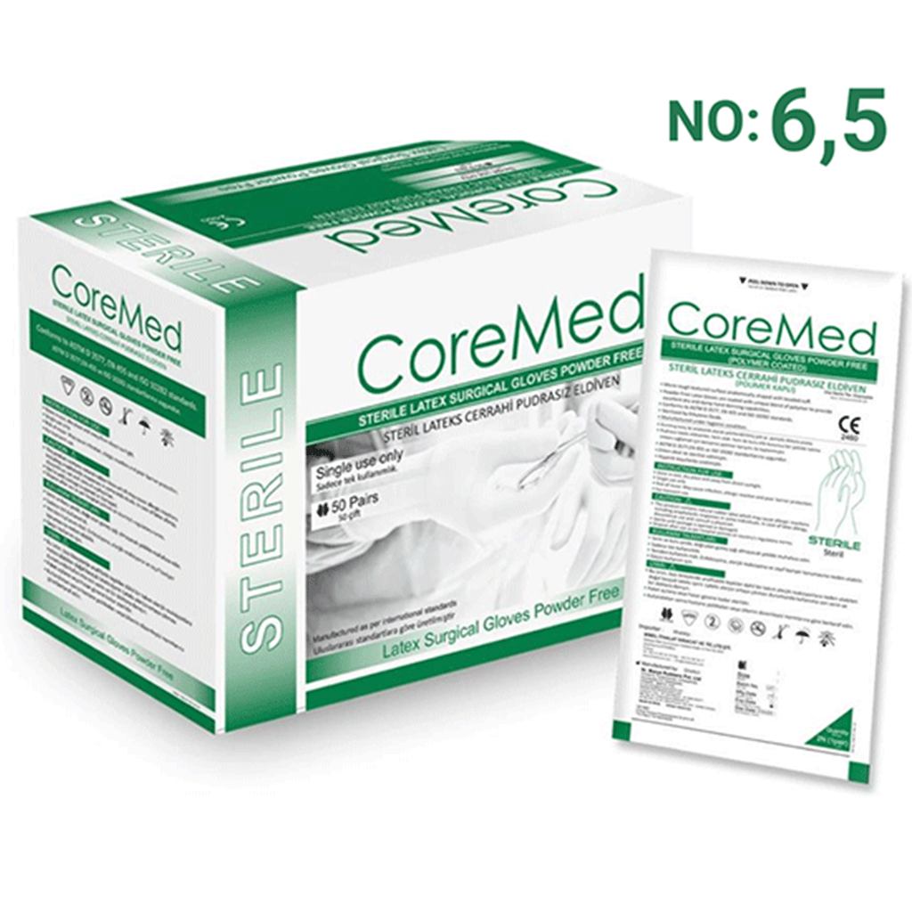 CoreMed Steril Pudrasız Cerrahi Eldiven 6.5 numara hassas medikal ve cerrahi işlemlerde maksimum hijyen ve güvenlik sağlamak için üretilmiş profesyonel bir eldivendir. Pudrasız yapısı sayesinde ciltle uyumludur, alerji riskini azaltır ve uzun süreli kullanımlarda dahi konfor sağlar. Üstün kavrama gücü ve yüksek hassasiyet sunan esnek lateks yapısı, işlem sırasında el becerisini artırır.
